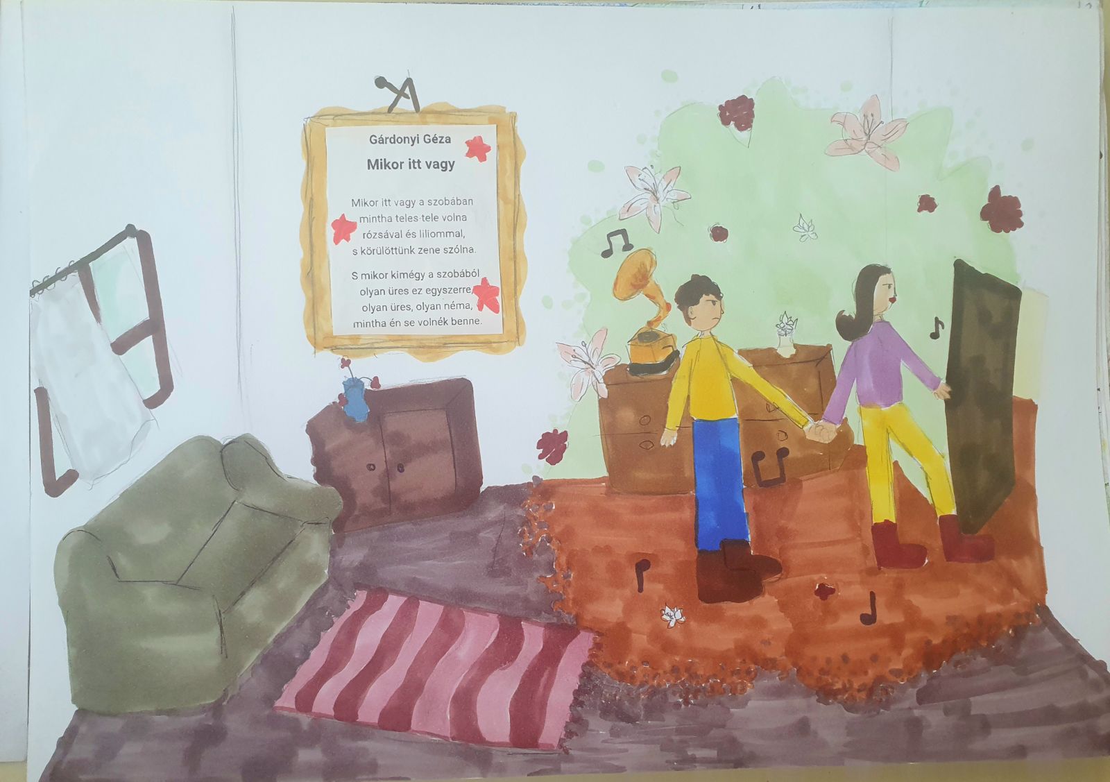 – Kész vagyok! Most már megnézheted – törte meg a csendet, amikor végre elkészült a nagy mű. Barátja feltápászkodott, mellé szökkent, és alaposan szemügyre vette az alkotást. Hirtelen nem is tudta, mit mondjon, némán meredt a papírdarabra. Végül ennyit sikerült kinyögnie: – Hát az egyszer biztos, hogy ez a kép nagyon … hát izé… nagyon zöld. Tengernyi zöld vékony fűszál nyújtózik az ég felé, ott középen pedig egy nagy vastag fűszálat ledöntött a szél.