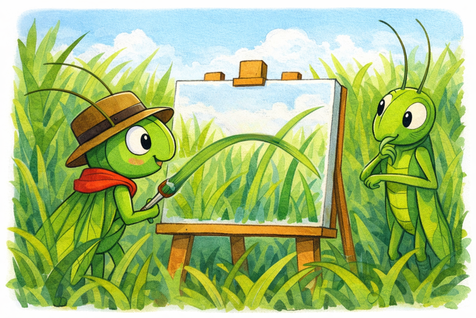 – Mert te is zöld vagy, mint a fű! Beleolvadsz a környezetedbe. De csak nem festhetek kék szöcskét! Vagy lilát, hogy jobban látszódjál!