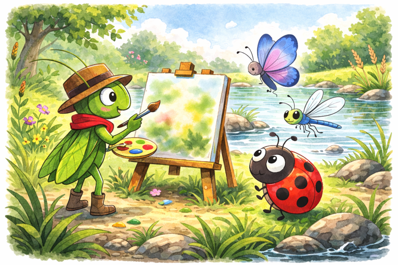 – Ezek itt az én festővásznaim – mutatott az összegyűrt papírdarabokra. – És íme, az ecsetem és a palettám! – húzta elő zsákjából diadalmasan kincseit, magasba emelve azokat. – Elhatároztam, hogy festeni fogok. Ciripelni minden tücsök tud. A tücsökzene közönséges. De a festészet, az más! Az különleges dolog. És én különleges akarok lenni!
