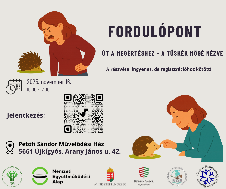Szeretettel hívunk és várunk benneteket a Fordulópont – Út a megértéshez, a tüskék mögé nézve című országos mini konferenciasorozat újkígyósi állomására,